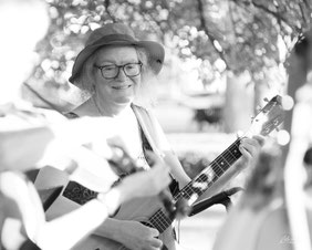 Bruce adds strong jamming skills to the mix, plus he plays the elusive pedal steel guitar (lessons provided also). We let one electric instrument squeak in because he's Ellen's brother!